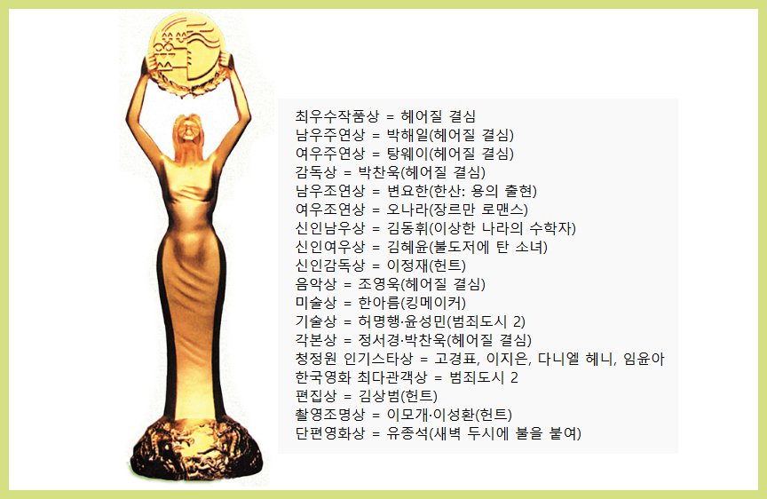 헤어질 결심은 최우수작품상, 감독상(박찬욱), 남우주연상(박해일), 여우주연상(탕웨이), 음악상(조영욱), 각본상(정서경·박찬욱) 등 6개 트로피를 차지했다.
