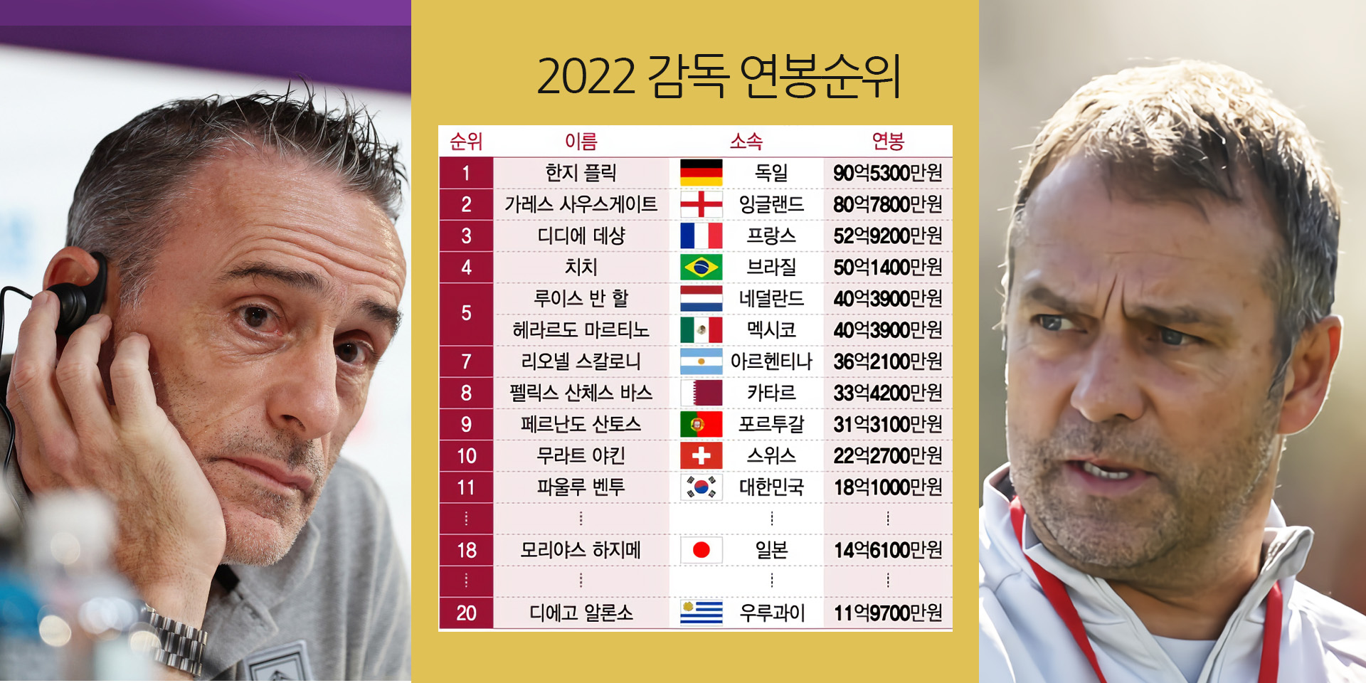 현재 1위는 독일 축구대표팀을 이끌고 있는 한지 플리크(57·독일) 감독이 90억으로 세계 최고 연봉을 받고 있는데 벤투 감독과 5배나 차이가?