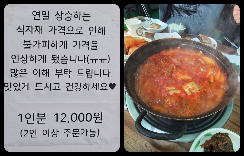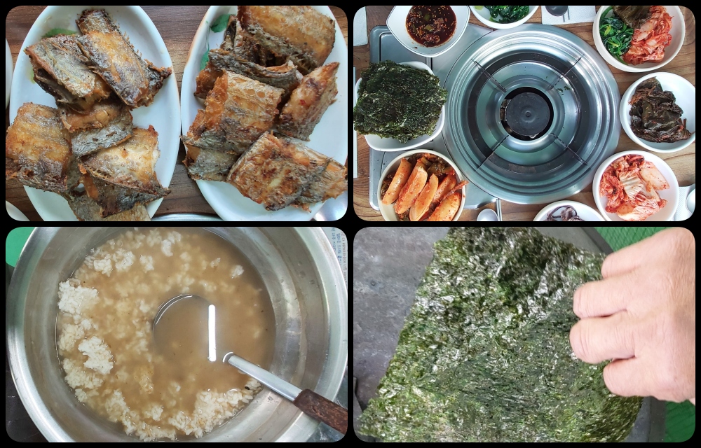 겨울이라 식당 한가운데 연탄불을 피운 난로에 햇김을 구워 먹으면 그 맛 또한 일품이라 공깃밥과 조림에 반찬만 먹어도 밥한 공기 뚝딱 사라진다.