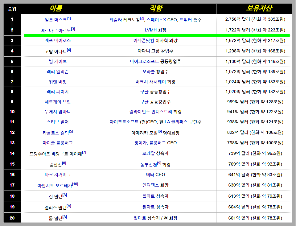 세계 최고의 갑부 일론머스크가 부동의 1위 자리를 프랑스 베르나르 아르노 루이비통 아르노 회장에게 잠시 내주며 1위와 2위 순위가 잠시 바뀌었었다.