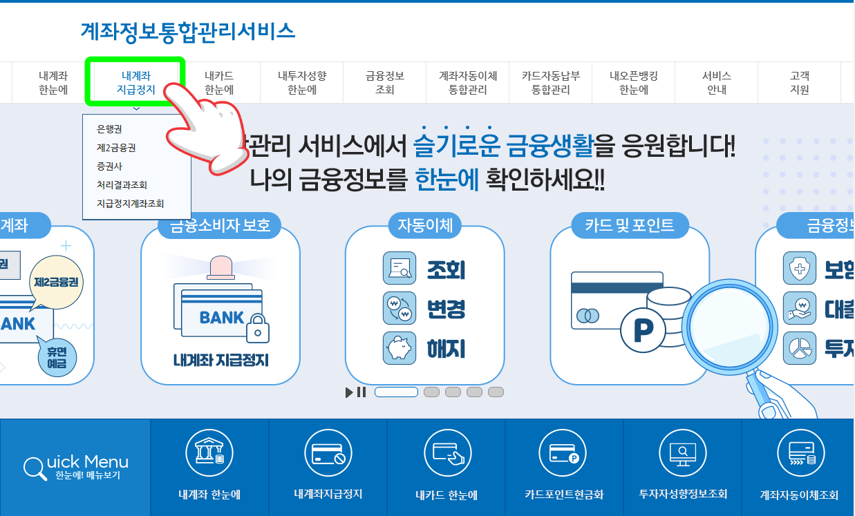 인터넷 검색창에서 계좌정보 통합관리 서비스를 검색하여 사이트로 접속 후 위의 이미지와 같이 좌측 상단 내 계좌 지급정지를 통해 처리 가능하다.