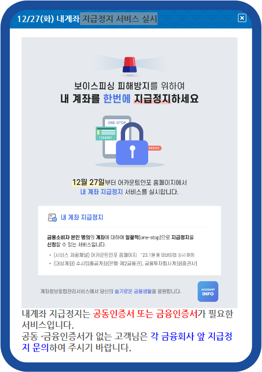 2022년 12월 27일부터 보이스피싱 등 금융사기 피해가 우려되는 모든 금융 계좌에 대해 일시에 신속하게 지급 정지를 신청할 수 있도록 바뀐다.