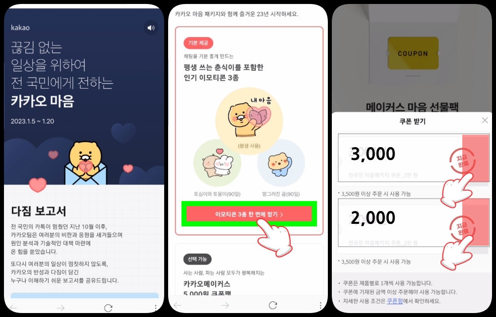 카카오톡에 접속 → 우측 제일 하단 점3개 터치 → '다짐 보고서' 아래로 내려→ 이모티콘 3종 한 번에 받기 클릭 →다운로드받으면 된다.