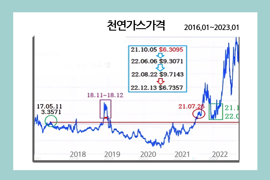 위의 그래프에서 보듯이 2019년 이후에는 국제유가는 배럴당 3달러선까지 붕괴했으며 코로나 19로 인해 LNG 가격은 2달러까지 떨어졌다.