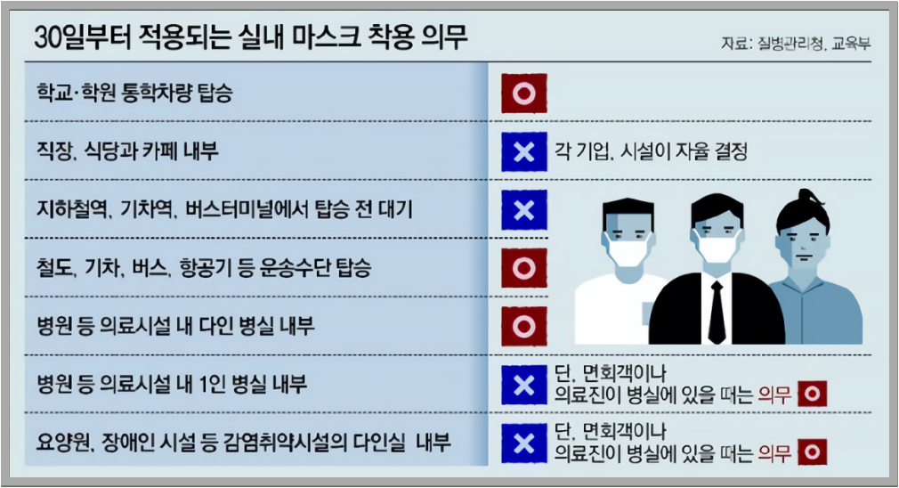 A 대형 입시학원은 코로나19 확산을 우려해 마스크 착용을 그대로 진행했으며 서울시는 민원인을 대면할 경우 마스크 착용을 유지는 등