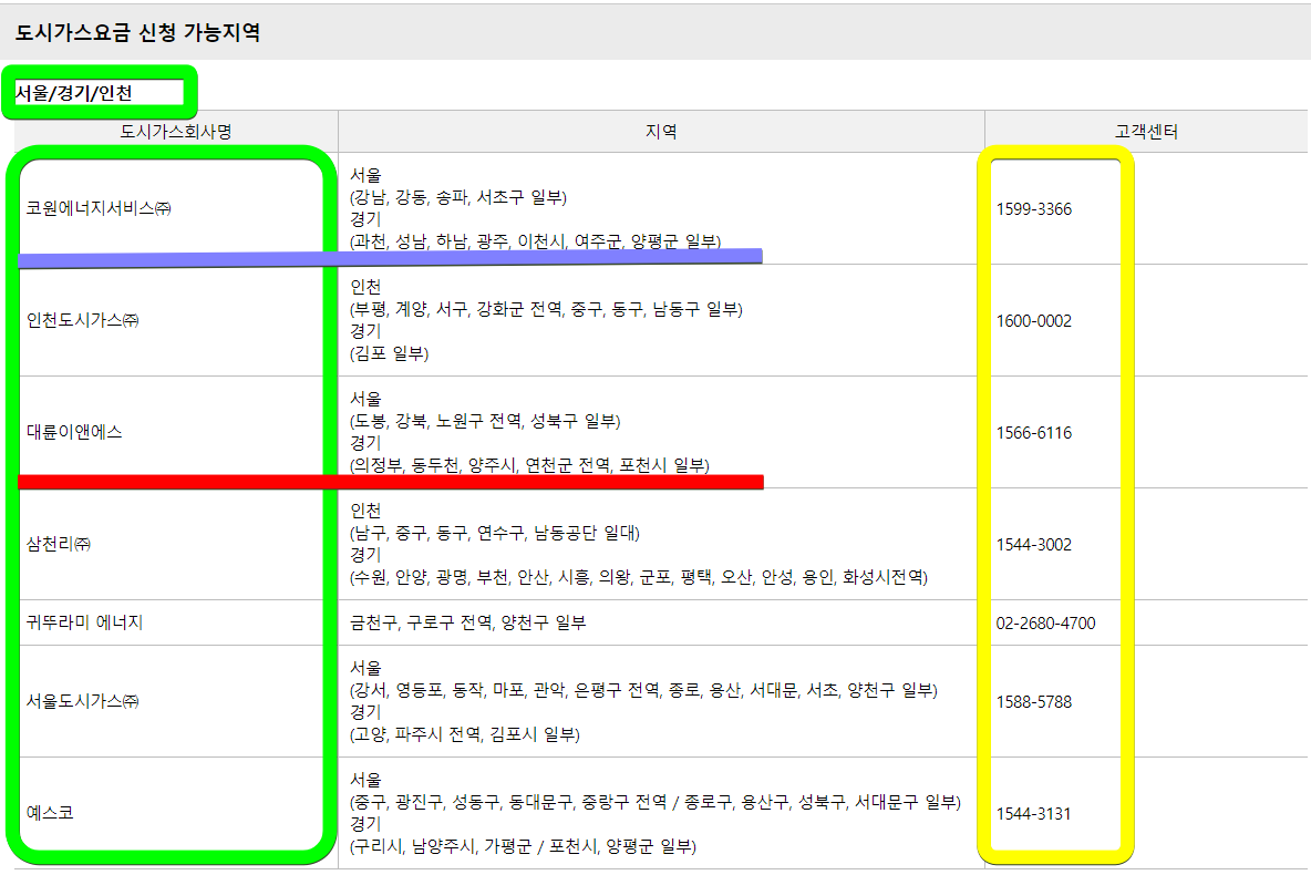 아래 표와 같이 같은 서울 지역이라도 강남, 강북, 강서 등 지역에 따라 가스 공급업체가 다르다는 것을 알 수 있다.