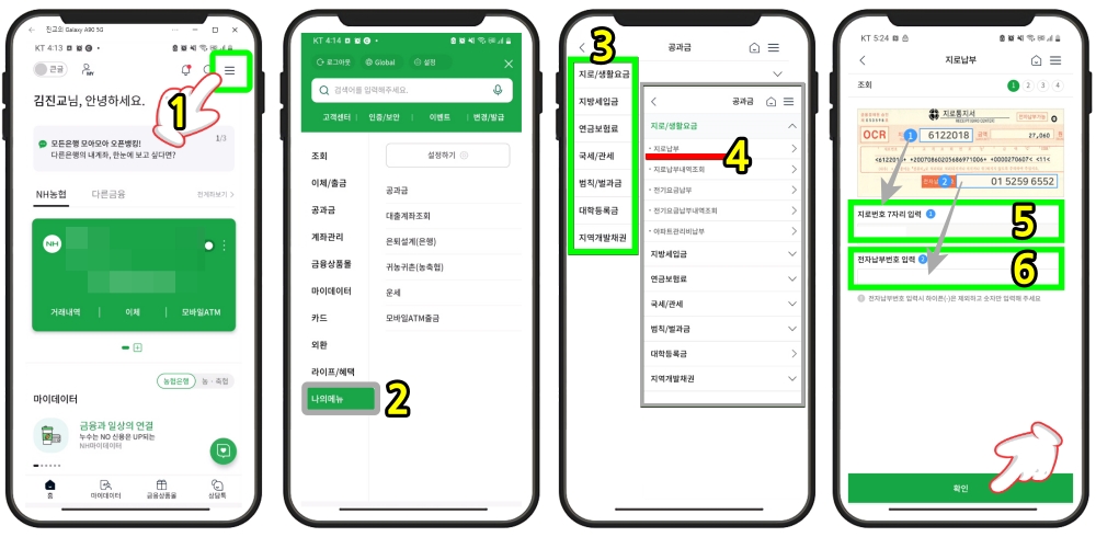 4. 지로 납부 → 5. 지로번호 7자리 입력 (확인) → 6. 전자납부번호 입력 (확인)