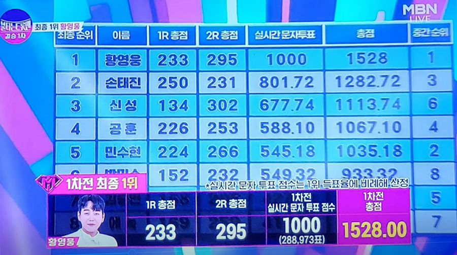 밤 0시가 넘어 생방송 국민투표 최종 결과 발표에서도 황영웅은 1528점을 보이며 1위 결과가 나오자 안도의 한숨을 쉬는 모양새였다.