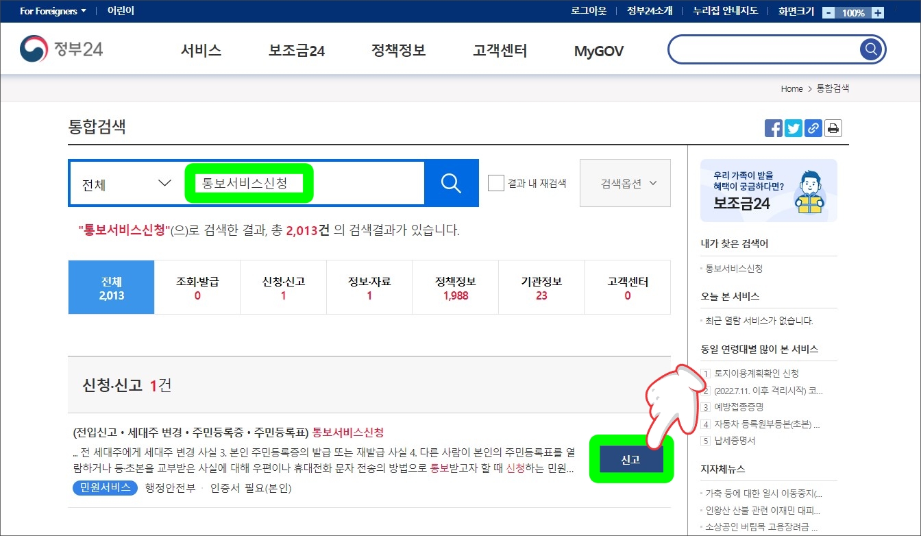 신고 방법은 가까운 주민센터에 신청하면 되며 정부 24 앱을 사용하는 사람이라면 통보서비스 신청을 검색> 신고하면 된다,
