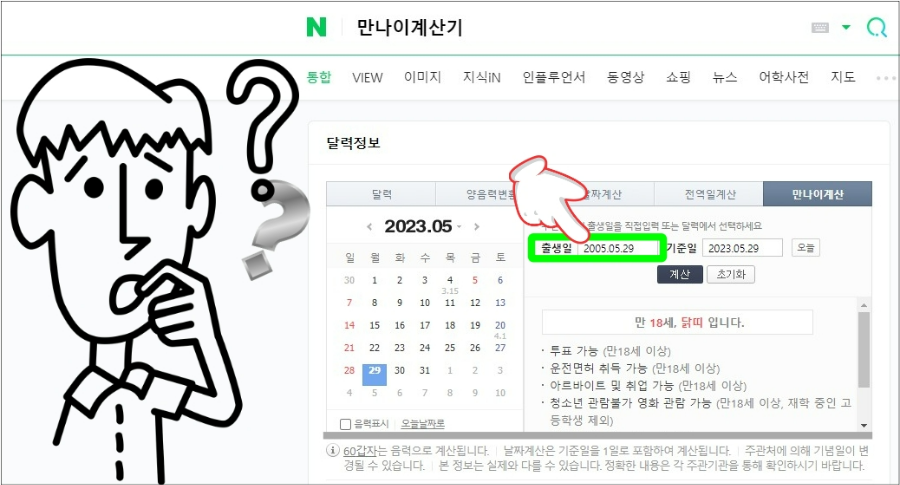설명을 들어도 만 나이에 대해 잘 이해가 되지 않는다면 네이버에서 만 나이 계산기를 검색해 보자.