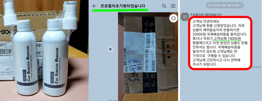 "고객님 환불 신청을 받았습니다. 해외발송이라 반품하시면 20000원의 국제배송비용이 들어간다"며 19000원을 환불해 주겠다고 한다.