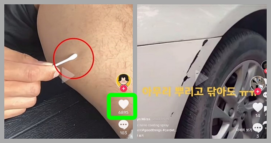 틱톡에 들어가서 우측 상단 돋보기를 클릭하고 점제거, 자동차 스크래치 복원, 지방제거 등 내가 원하는 단어로 검색을 반드시 먼저 해보자.