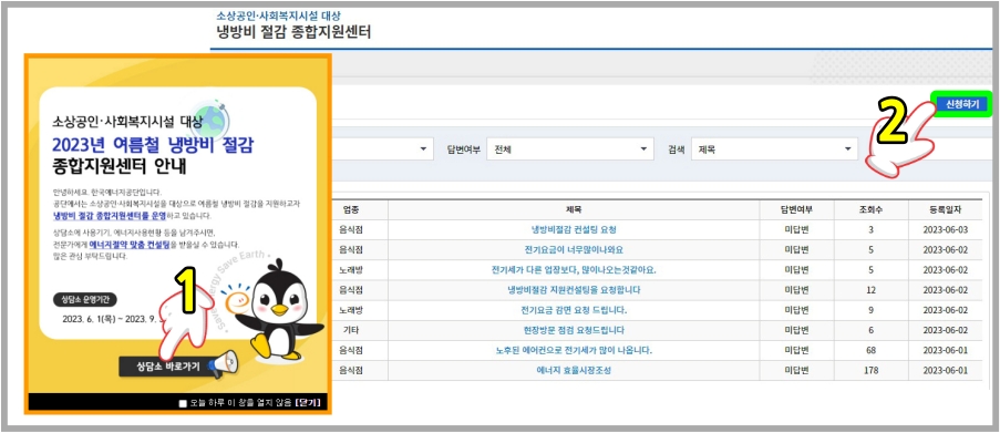 아래 이미지 순서와 같이 한국에너지공단 홈페이지에 들어가 좌측에 2023년 여름철 냉방비 절감 종합지원센터 안내 팝업창을 클릭하면