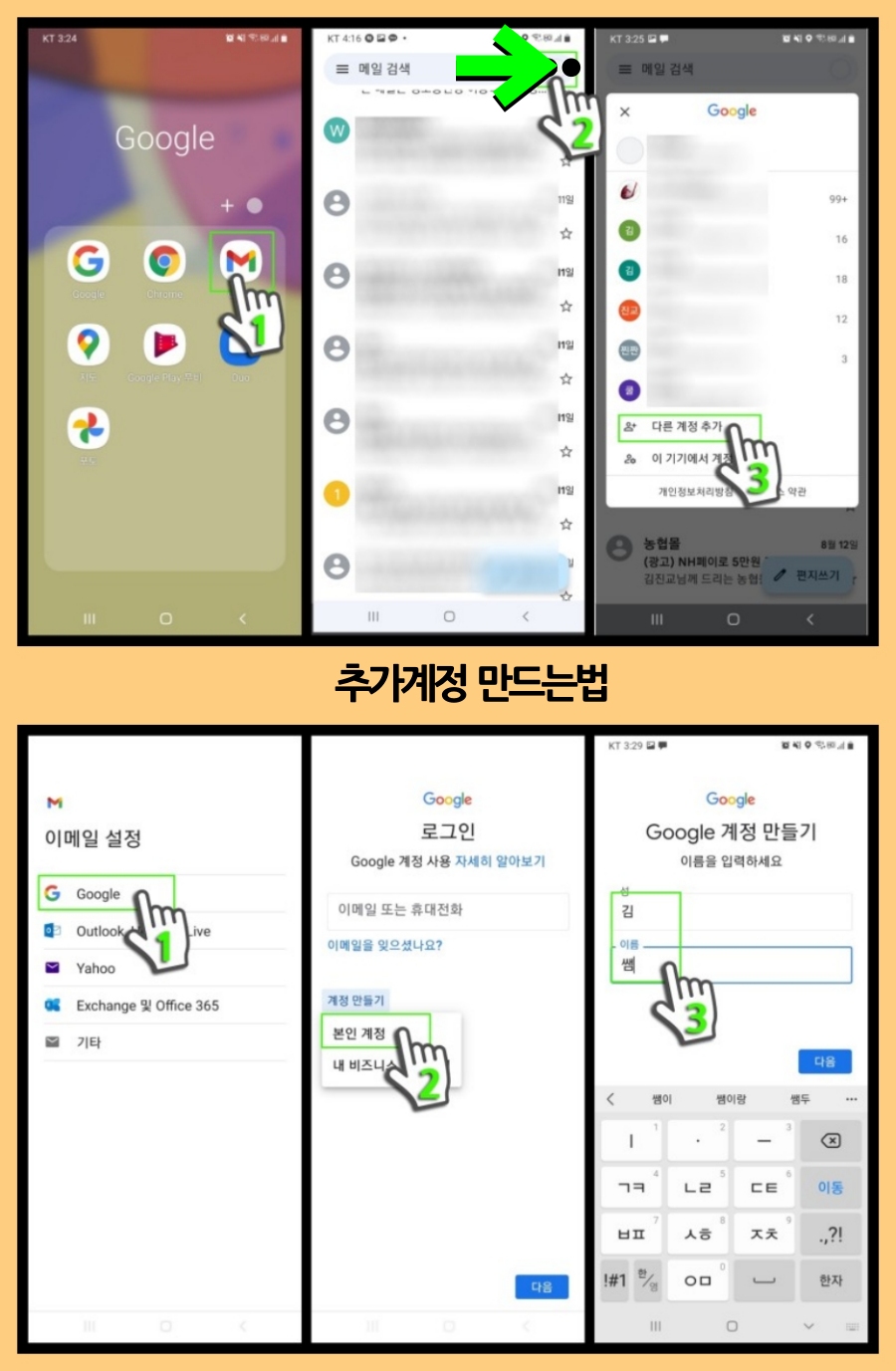 이메일 계정에서 1.구글 클릭 → 2. 계정만들기 → 본인계정 클릭 → 성과 이름 작성 후 우측하단 다음 클릭 → 생일, 성별 작성 → 다음 →