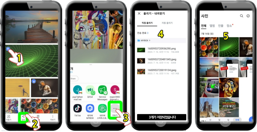 1. 내 휴대폰에서 사진이나 동영상이 저장된 갤러리를 탭 한 후 마이박스에 저장하고싶은 중요한 사진이나 영상 데이터를 선택해 준다.