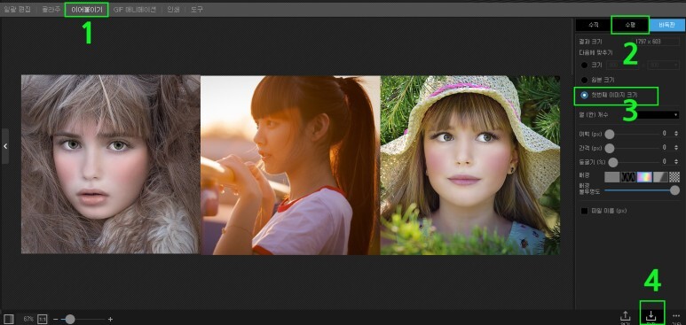 1, 이어 붙이기 → 2. 수평 선택