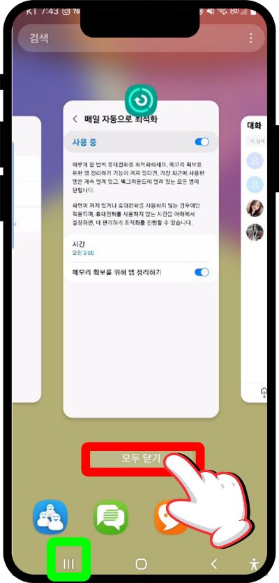 휴대폰 화면 좌측 하단에 삼선을 클릭하면 사용하고 있었던 앱들이 모두 뜨게 되는데 화면 바로 위에 모두닫기 클릭을 해주면 깔끔하게 해결된다.