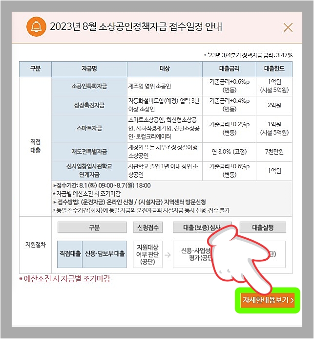 소상공인 정책자금 홈페이지 ← 링크를 클릭해 홈페이지 우측에 보면 정책자금 접수일정에서 우측하단 자세히 보기를 참고하면 된다