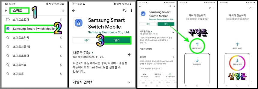 스마트 스위치 앱이 없다면 갤럭시 스토어에서 스마트 스위치로 검색하면 S자 모양의 아이콘을 신형과 구형 모두에 설치해 준다음