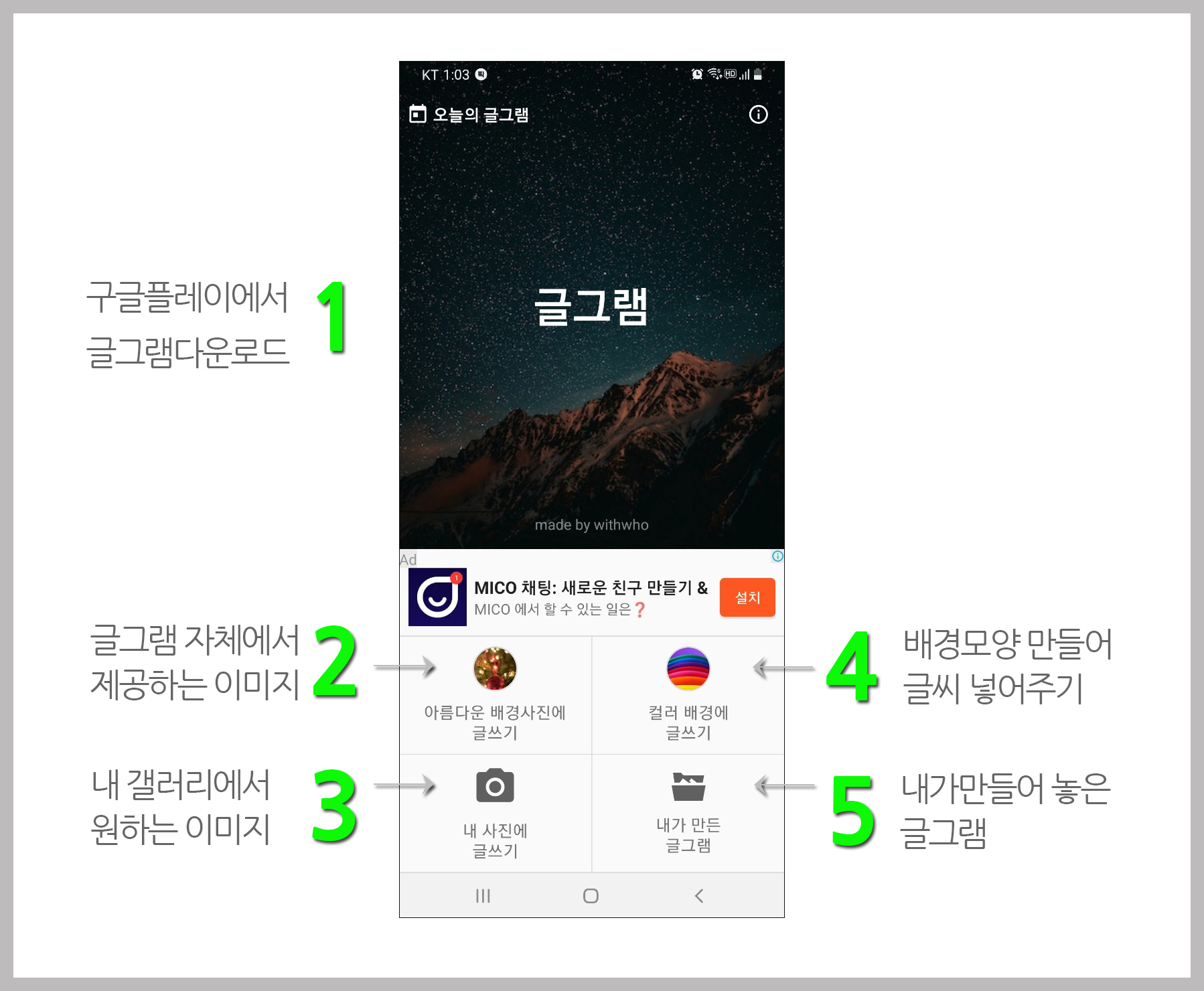 1. 구글 플레이에서 글그램을 다운로드 ↓ 아래와 같은 이미지가 보입니다.