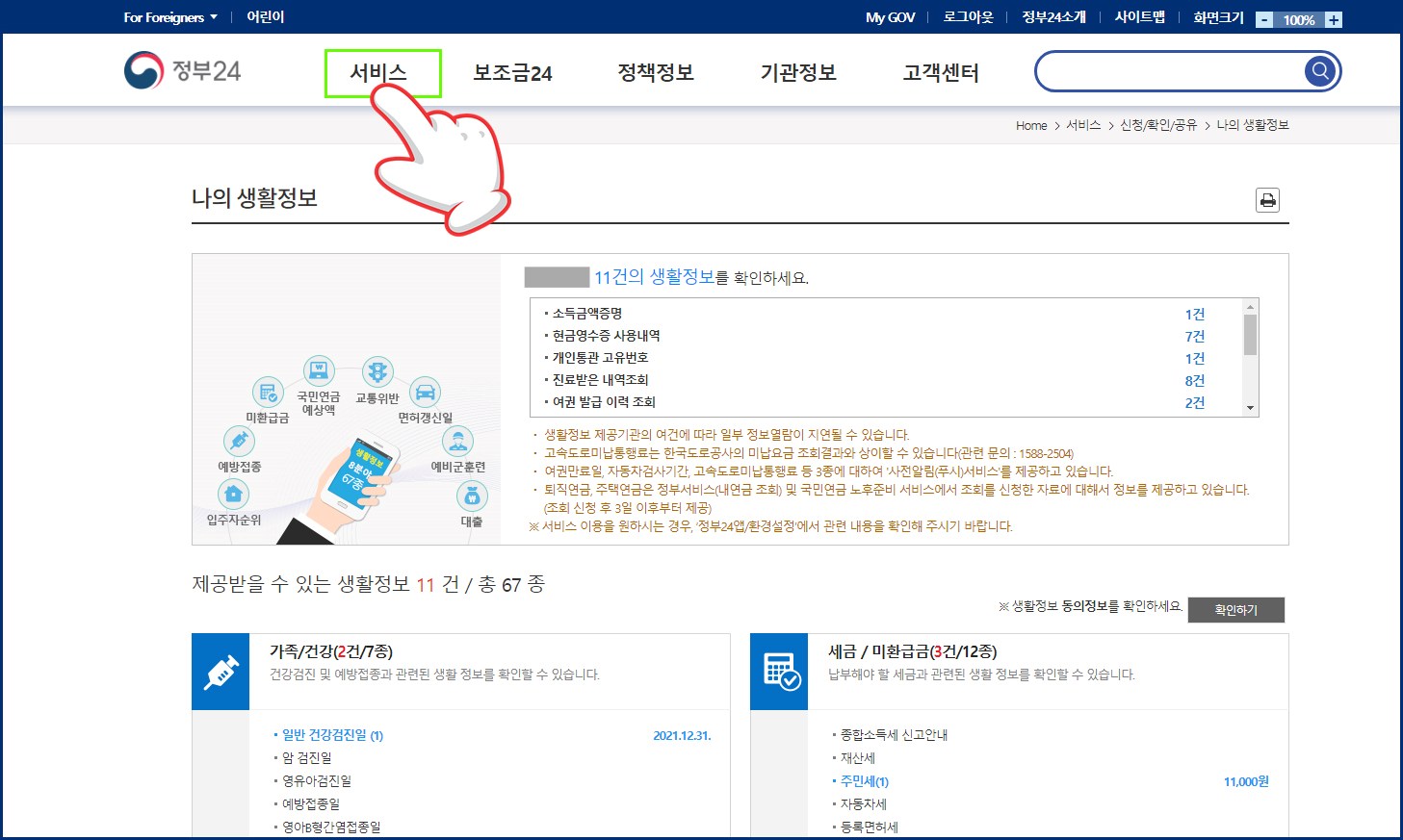 제일 좌측상단 서비스를 클릭 → 나의 생활정보를 클릭해보세요. 내가 미처 몰랐거나 잊어버렸던 예방접종부터 미환급금, 면허 갱신 일등 등 생활정보 67종에 대해 알림 서비스까지 해주고 바로 출력까지 가능하니 정말 필요치 않을까요?