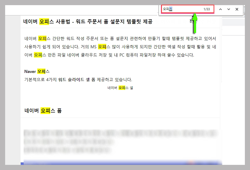 이번에는 내가 작업한 키워드를 네이버나 다음 검색창에서 검색해 봅니다. 해당 키워드로 가장 상위에 올라있는 블로그에 들어갑니다. 해당 블로그에서 Ctrl+F 를 누르시면 박스가 나타납니다. 박스 안에 키워드를 입력하시면 키워드 옆에 수량이 나타납니다. 그 사람보다 1개만 더 수량을 늘려주시면 됩니다.