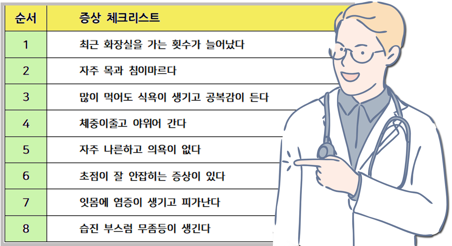 1. 화장실을 자주 가는 이유는 포도당이 밖으로 나갈 때 혼자 나갈 수 없어 물을 끌고 나가 평소보다 자주 소변을 보게 된다