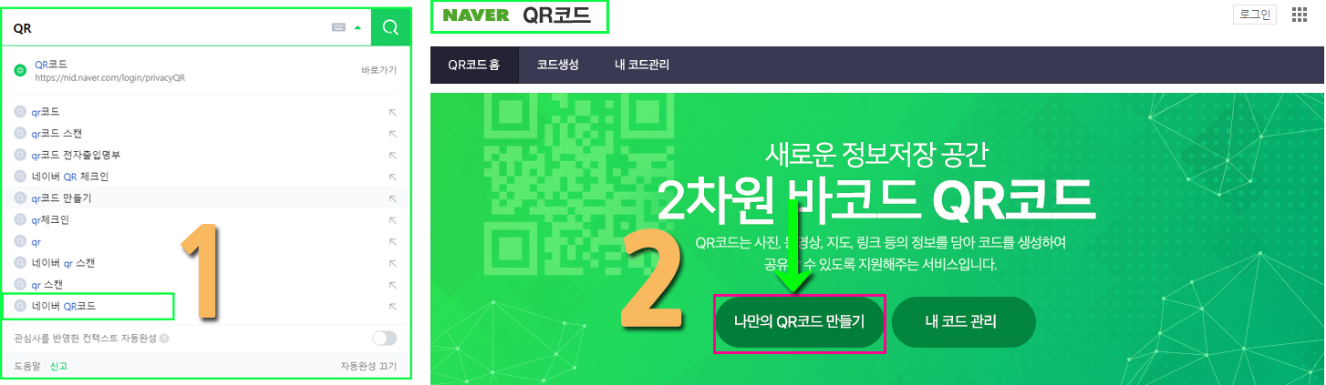 네이버 검색창에서 QR이라고 치면 자동으로 네이버 QR코드 가 보이게 됩니다. → 클릭 → 한 번 더 상단의 네이버 QR코드 클릭 → (2) 번과 같이 나만의 QR코드 만들기 클릭→ 네이버 로그인 → 제목 코드를 입력하라고 나옵니다.