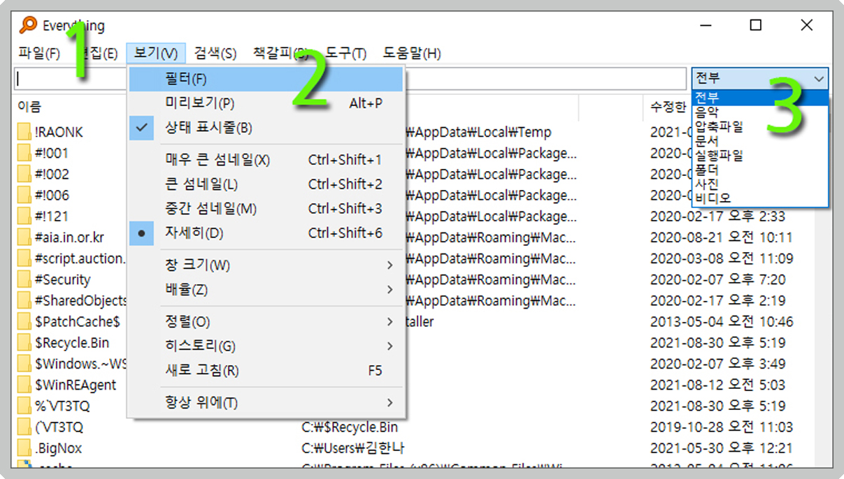 우측 상단 보기에서 필터 클릭 → 우측에 전부라고 박스 나타남 → 음악, 압축파일, 문서, 실행파일, 폴더, 사진, 비디오 등의 카테고리가 나타나는데 원하는 카테고리를 선택해 줍니다,