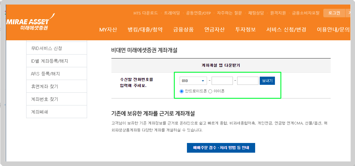 원하시는 증권사 명을 클릭하면 사이트로 이동하게 되고 미래에셋증권의 경우 전화번호를 입력해 주세요. (핸드폰 종류 선택) → 전화번호 입력 → 보내기 하면 바로 핸드폰으로 문자메시지를 받게 됩니다.