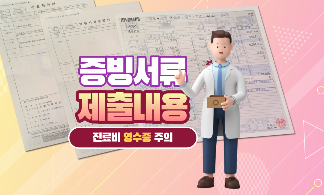 ● 수술 확인서 ● 입원 사실증명서 혹은 진단서 ● 진료비 영수증 ● 본인의 신분증 앞뒷면 복사