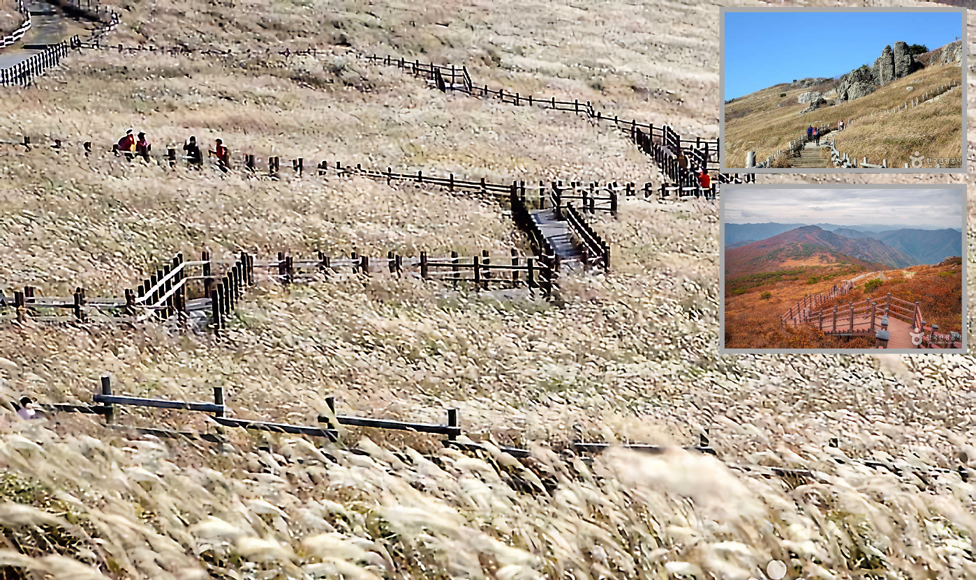 가을바람이 불때마다 잔잔한 물결이 일렁이는 은빛 바다로 변한다. 파란 하늘과 맞닿은 끝없는 억새 물결은 그야말로 장관이다. 산이 높다고 미리 겁먹을 필요 없다. 어린이도 오를 가뿐한 코스인데다가, 걷는 내내 단풍이 오색찬란하다.