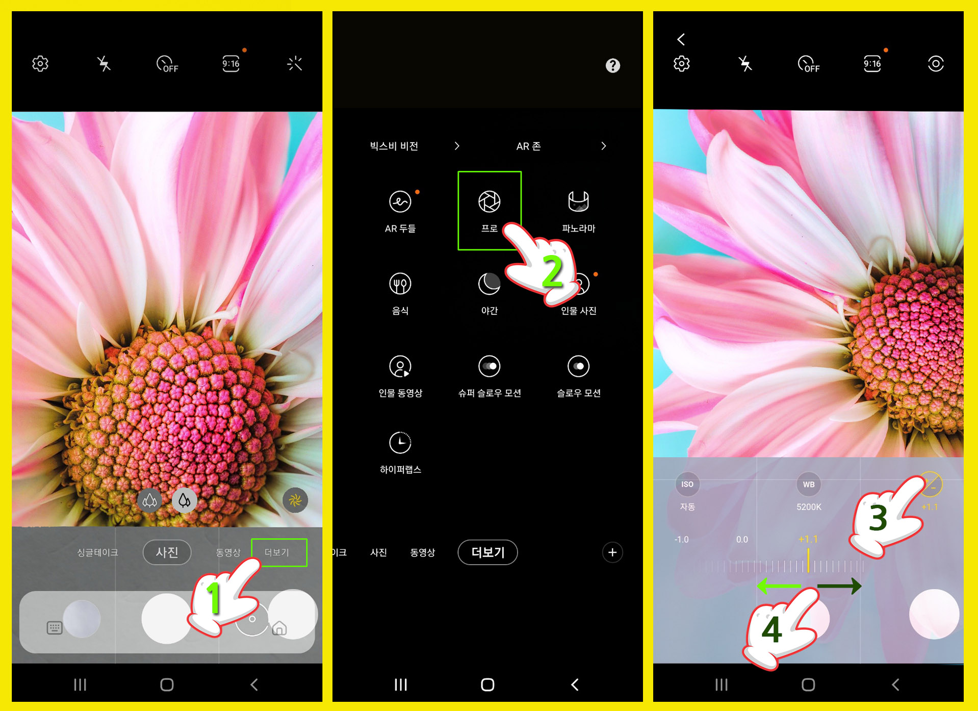 카메라에서 1번과 같이 더보기 클릭 → 2번과 같이 프로 선택 (카메라 조리개 모양) → 3번 우측의 +1.1 클릭해주면 4번과 같이 눈금이 나타납니다. 눈금을 우측으로 밀면 어두워지고 좌측으로 밀면 밝아지게 됩니다.