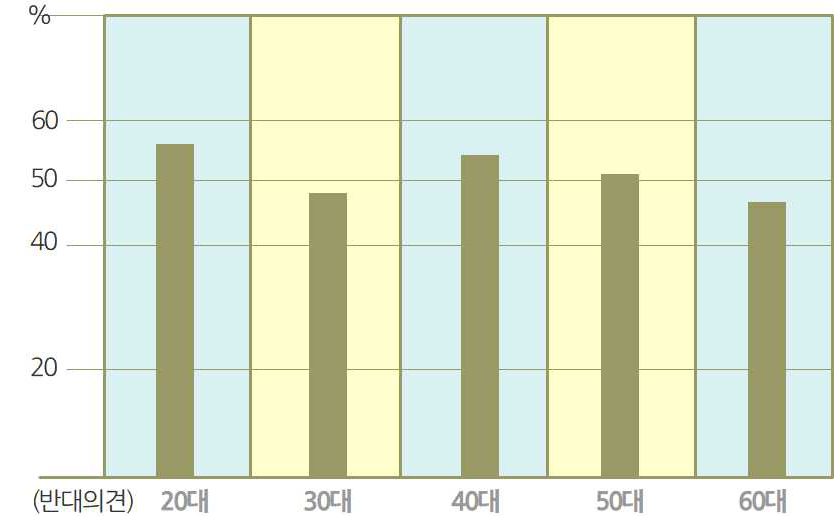 반대의견으로는 20대가 56.7%로 가장 높게 나타났으며 30대46.8%, 40대 54.7% 순으로 나타났으며 찬성의 경우는 30대가 43.9%로 가장 높게 나타났다.