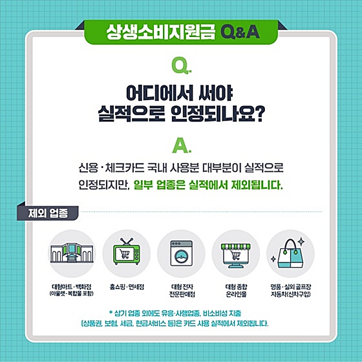또한 명품전문매장과 면세점, 홈쇼핑, 유흥업종, 사행업종, 실외골프장등에서 사용한 경우와 자동차(수입·국산) 구입, 해외 직구등으로 사용된 신용카드나 체크카드는 캐시백 대상에서 제외된다.