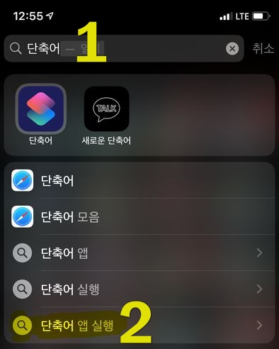 1. 검색어 화면을 활성화 → '단축어' 입력→ 단축어 어플 실행하기