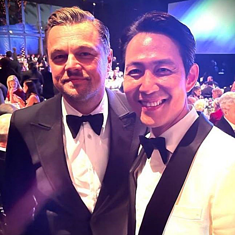 이정재와 레오나르도 디카프리오는 어깨를 맞대고 편안하게 카메라 앞에서 포즈를 취하고 있다. 이정재는 흰 슈트를 입은 채 레오나르도 디카프리오와 부드러운 미소가 눈길을 끈다.