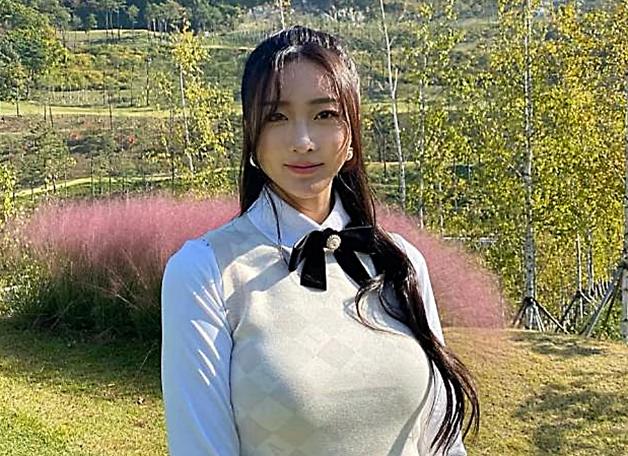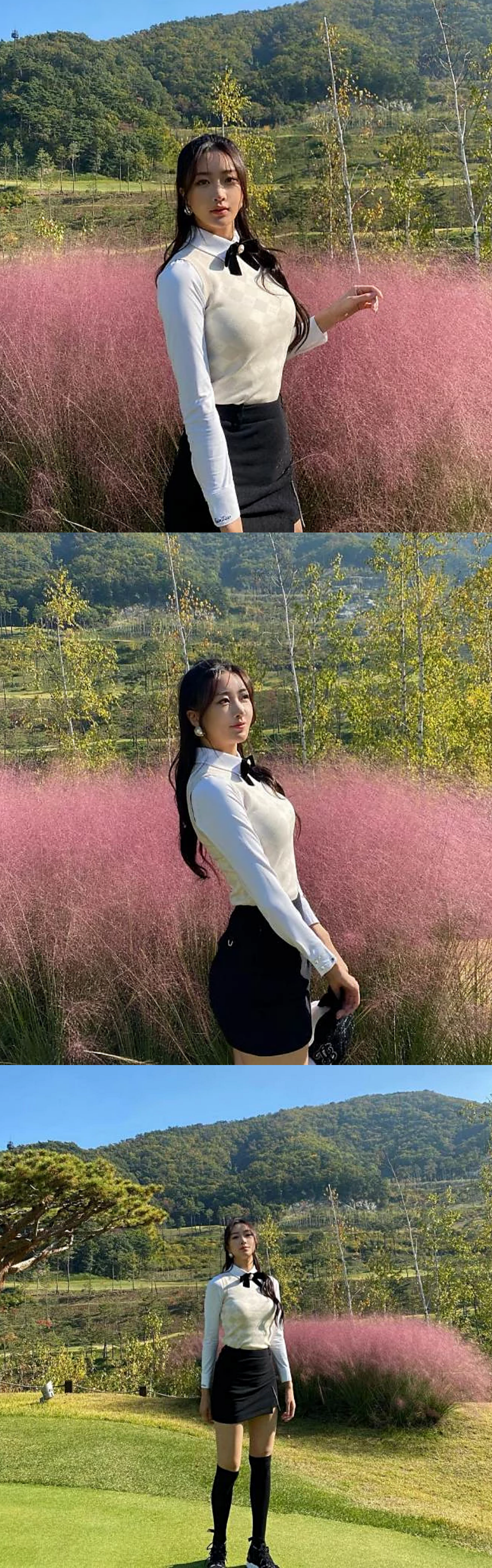 사진들의 대부분 배경은 필크뮬리 골프장 라운드를 배경으로 촬영했는데 단추를 꽉 채운 셔츠 위에 나비 리본과 아이보리색 골프 조끼를 입고 골프룩 차림이었다.