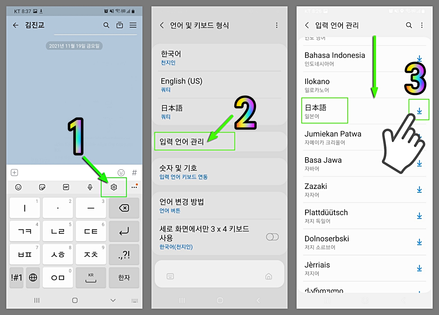 우선 자판이 뜨게 한 상태에서 우측상단 설정(톱니바퀴)클릭해 준다. → 언어및 키보드 형색 선택 → 입력언어관리 선택