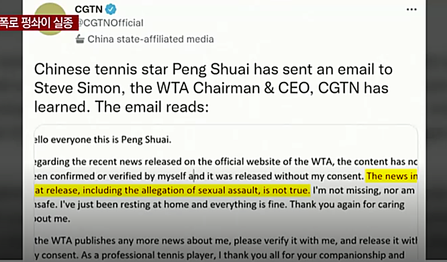 펑솨이의 성폭행 폭로는 전세계에 충격을 주었으며 많은 사람들의 시선이 집중된 가운데 중국 공용매체 언론은 펑솨이가 아무런 문제 없이 집에서 쉬고 있으며 성폭행 의혹은 사실이 아니다. 라는 요지의 편지를 WTA에 보냈다고 보도했다.