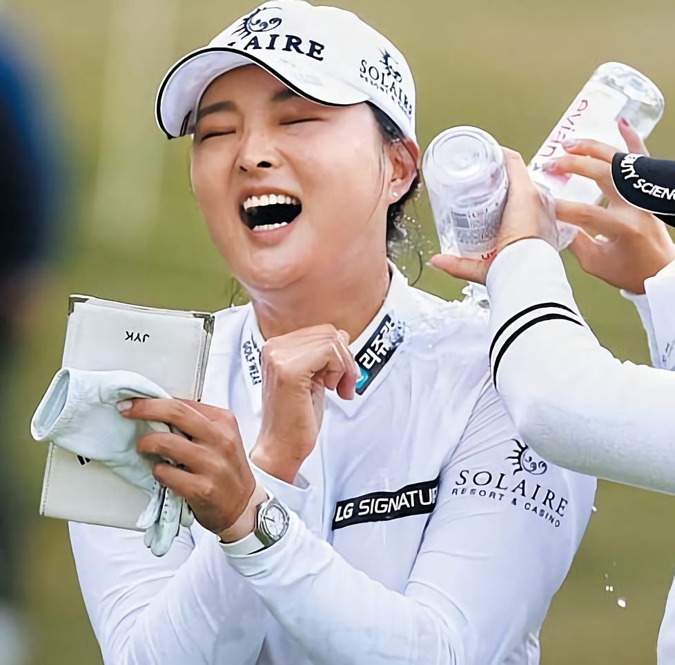 고진영선수가 우승후 물세례를 받고있다.(자료: chosun)