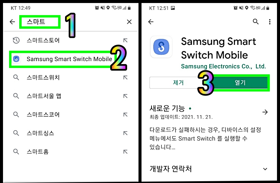 구글 플레이에서 Smat switch나 한글로 스마트 스위치를 검색해서 위의 그림과 같이 다운로드로 어플을 설치해준다. 물론 두 개의 핸드폰 모두에 설치해 준다.