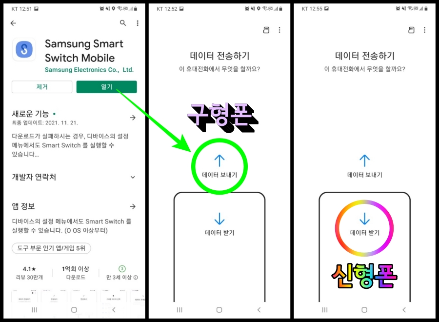2개의 핸드폰을 놓고 설정에서 하단에 동의 → 허용 →데이터 보내기기 ↑(구형폰)와 받기↓(신형폰) 데이터 받기를 클릭해 준다. 어플 설치가 끝난 후 데이터 옮기는 방법 2가지가 나온다.