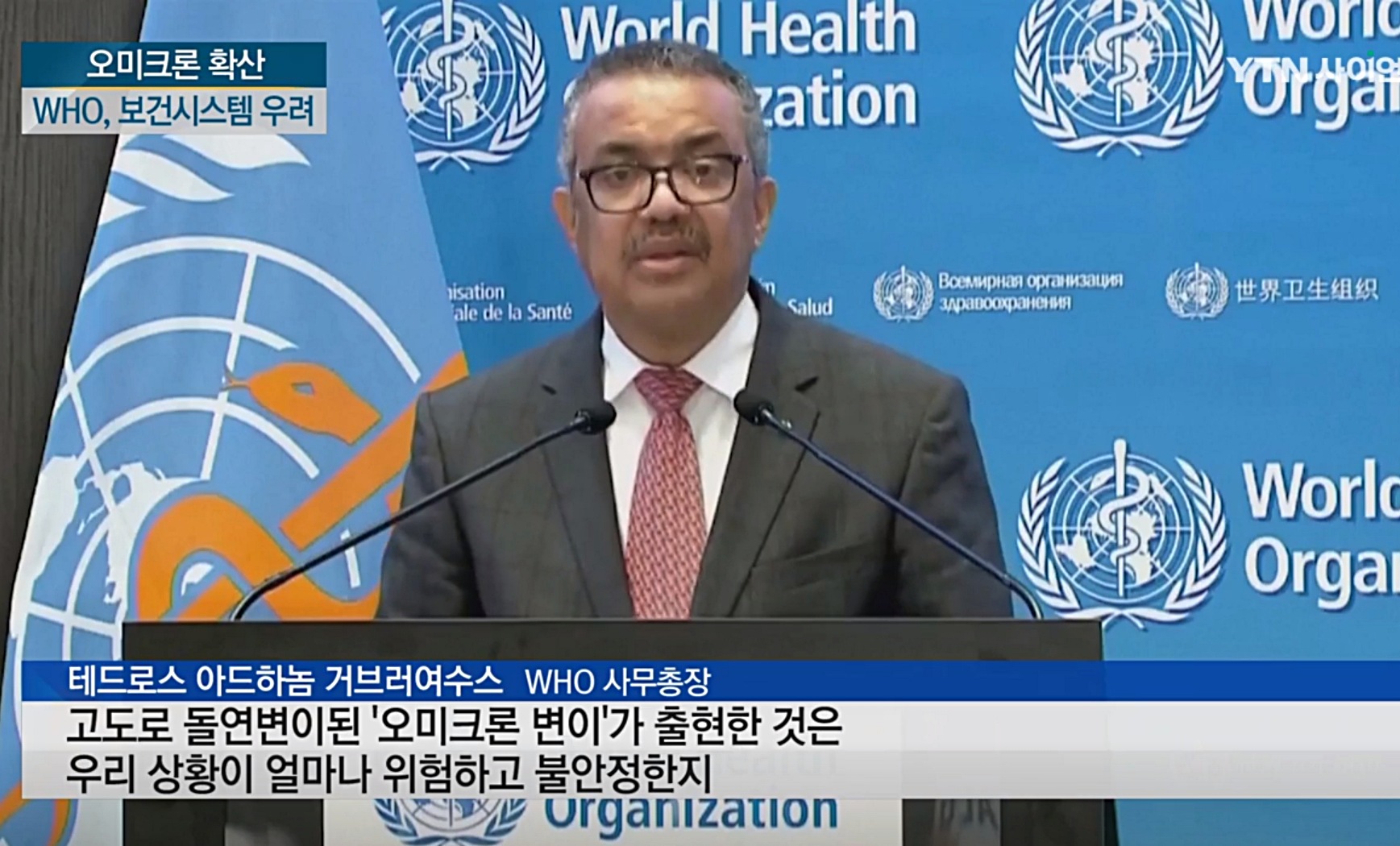WHO 사무총장은 고도로 돌연변이된 오미크론 변이가 출연한 것은 우리 상황이 얼마나 위험하고 불안정한 지 분명하게 보여주고 있다고 발표하고 있다.