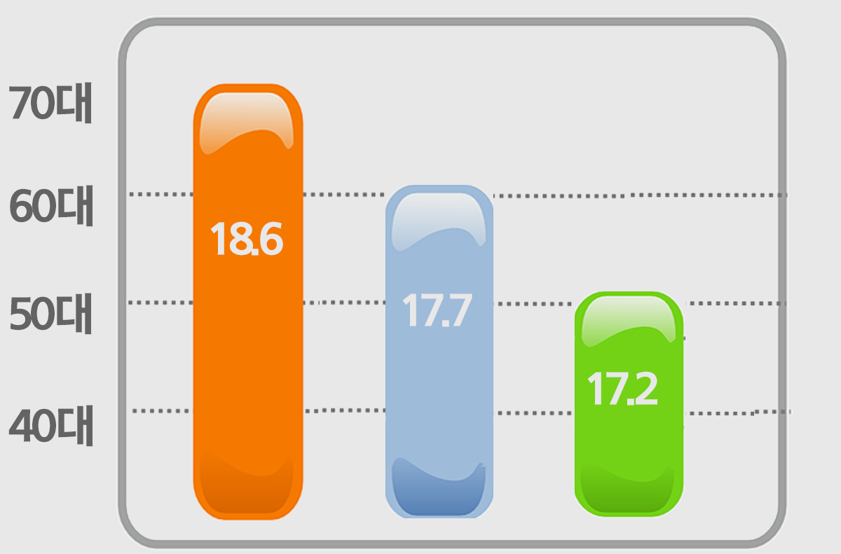 도표에서 보는것과 같이 70대가 가장 많았으며 60대와 50대가 그 뒤를 이어 1인 가구가 많은 것으로 나타났다.