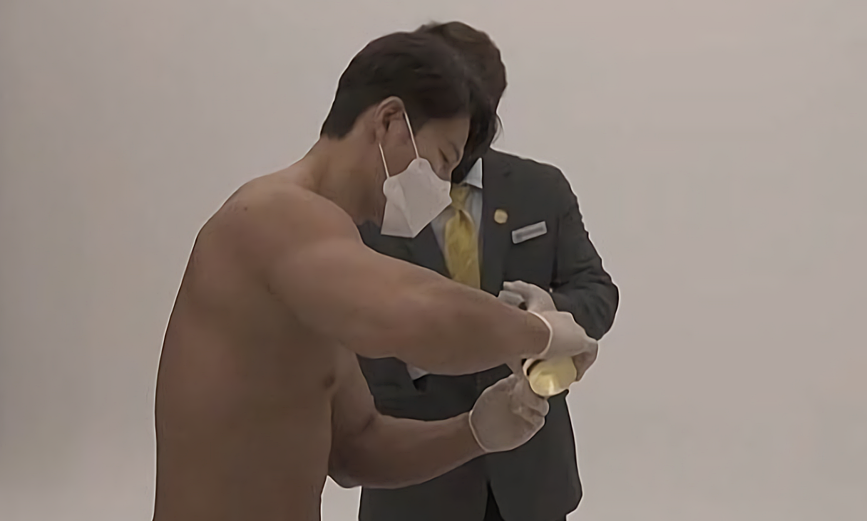 김종국은 이미 보디빌딩 선수로 등록돼 있으며 13일인 이날은 윗옷을 완전히 벗고 검사관들 앞에서 소변 검사를 받는 뒷모습까지 모두를 공개했다.