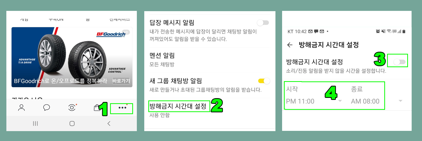 우측 하단의 점 세 개 클릭 → 설정 (상단 톱니바퀴) → 알림 → 방해금지 시간대 설정하기 → 활성화시키고 시간 설정