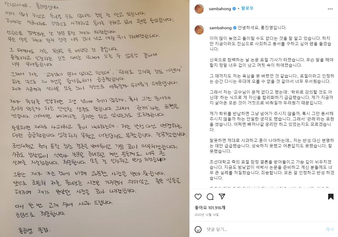 가수 홍진영이 대학 석사 논문을 표절했다는 논란속에 조선대는 재심사에 들어갔었고 정확히 1년 전인 12월 23일 대학원위원회를 연 뒤 "홍진영 석사 논문을 표절로 판정했다"며 "이에 따라 홍진영의 석·박사 학위가 모두 취소되었다.