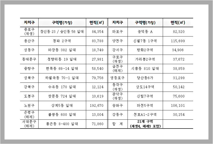 28일 서울시는 신속 통합기획 민간 재개발 후보지로 종로구 창신동 53번지 일대와 숭인동 56번지 일대, 구로구 가리봉 2구역, 동작구 상도 14구역, 관악구 신림 7구역 등 21곳을 선정하고 발표했다.
