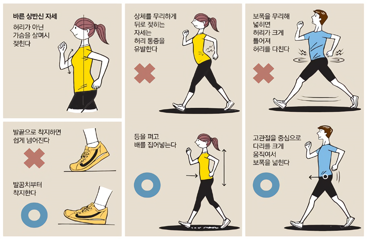 1. 허리와 무릎을 곧게 펴고 시선은 전방 10m 정도를 내다보며 걷는 것이 좋다.